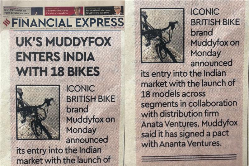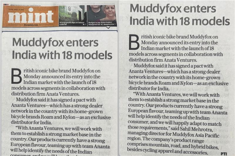 Muddyfox said it has signed a pact with Ananta Ventures, which has a strong dealer network in the country with its homegrown bicycle brands Roam and Kylon, as an exclusive distributor for India